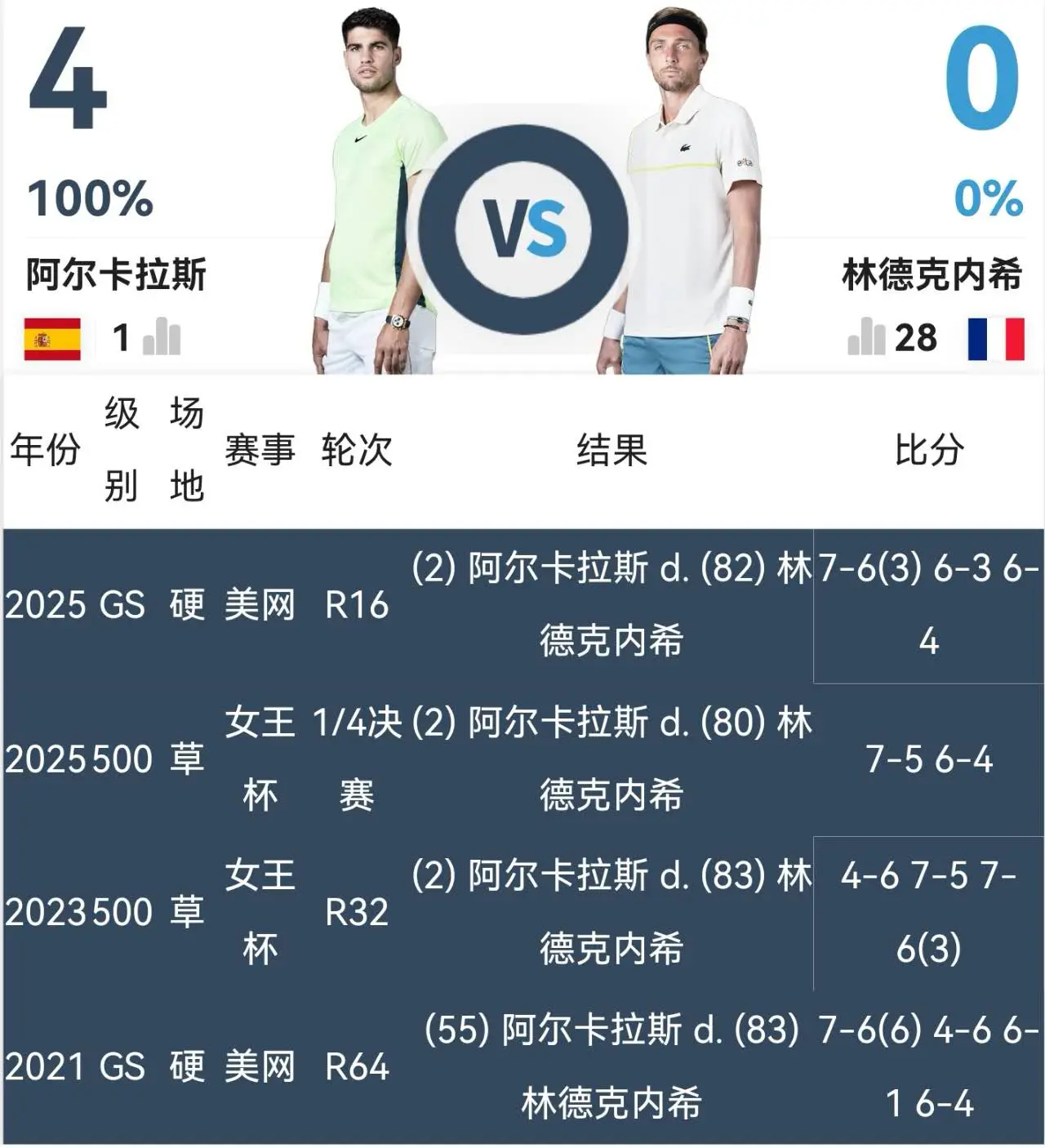 2023年ATP500伦敦女王杯第一轮,林德克内希惨遭阿尔卡拉斯逆转击败。还是草地菜鸟的阿尔卡拉斯此战之后仿佛突然在草地赛场开窃了,最后连胜五场夺取女王杯冠军,一举完成从草地菜鸟到草地冠军的华丽转身。2025年伦敦女王杯1/4决赛,阿尔卡拉斯两盘战胜林德克内希,最后第二次夺取女王杯冠军。