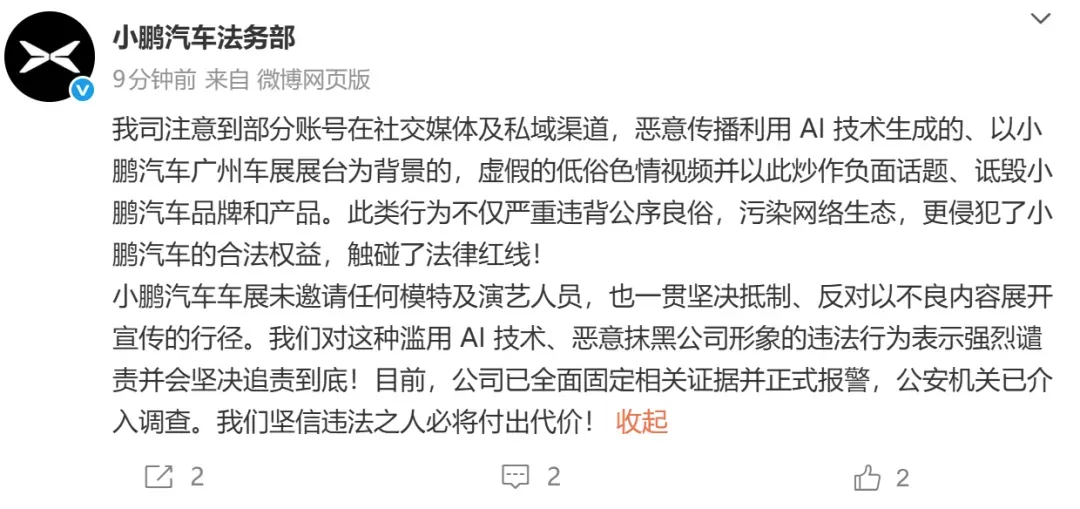 11月28日,小鹏汽车法务部发文称,该司注意到部分账号在社交媒体及私域渠道,恶意传播利用AI技术生成的、以小鹏汽车广州车展展台为背景的,虚假的低俗色情视频并以此炒作负面话题、诋毁小鹏汽车品牌和产品。“此类行为不仅严重违背公序良俗,污染网络生态,更侵犯了小鹏汽车的合法权益,触碰了法律红线!”